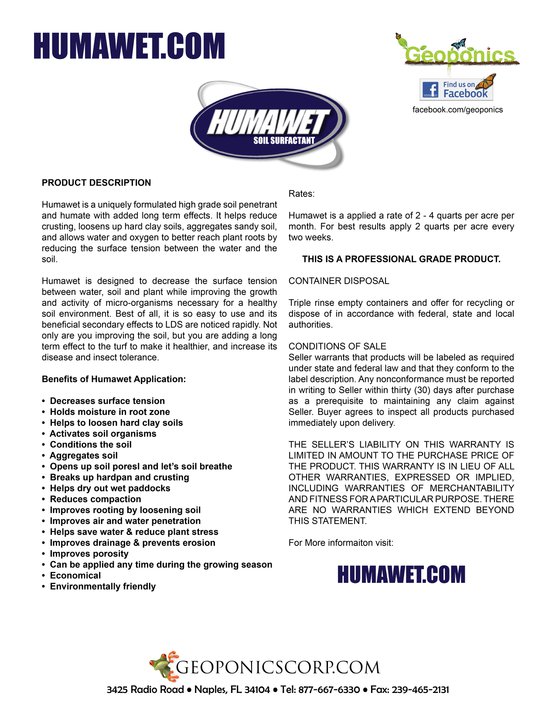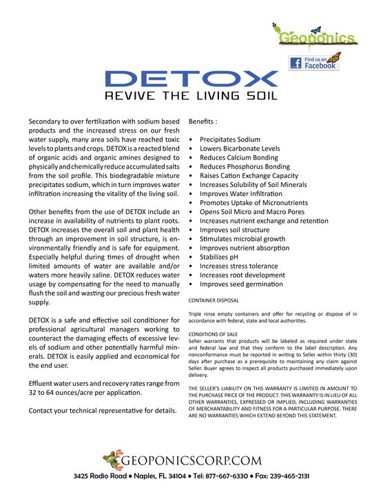 Geoponics Products PRODUCT TYPE INTERVALS RATES PACKAGING Penterra Soil Penetrant 14-21 days 2-4 Lts/Ha 9.45lts Detox Soil Conditioner 14-28 days 2-4 Lts/Ha 9.45lts Humawet Soil Penetrant and Humate Blend 14-21 days 2-4 Lts/Ha 9.45lts Geospore Mycorrhiza 1.7-2.6m spores/Ha Hollow Tining 9.1 kg/Ha 9.1kg Agriox 5kg Sprayable Oxygen 30 days 5 kg/Ha 5kg Click on product name to download product sheet.
